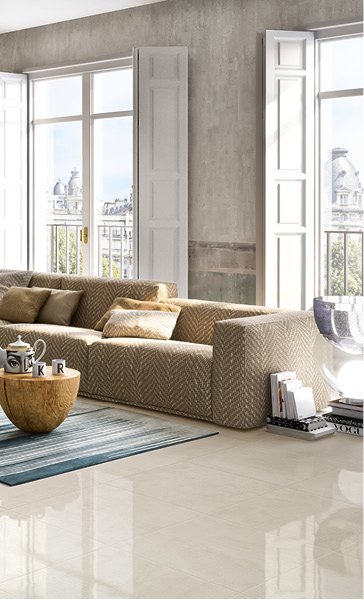 Le carreau est imprimé numériquement avec le graphisme souhaité (effet marbre, bois, pierre, résine, ciment), émaillé avec un vermis sablé et rodé pour obtenir un effet brillant ou semi-brillant selon le type de polissage.
