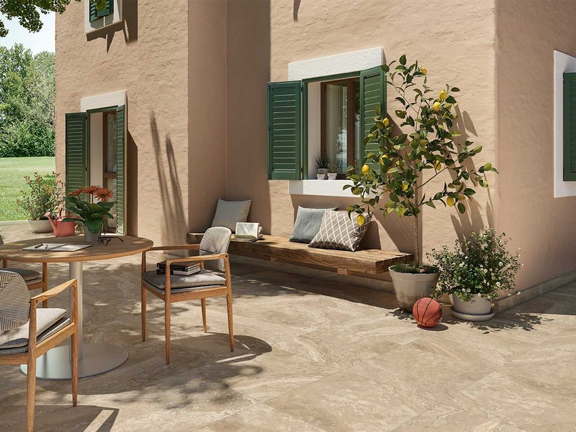 Les carreaux Elegance Travertino, réalisés en grès cérame rectifié, sont disponibles au format 60x60 cm, avec une épaisseur de 9 mm et un indice de résistance à la glissance R11, ce qui rend le produit idéal pour les espaces extérieurs.
