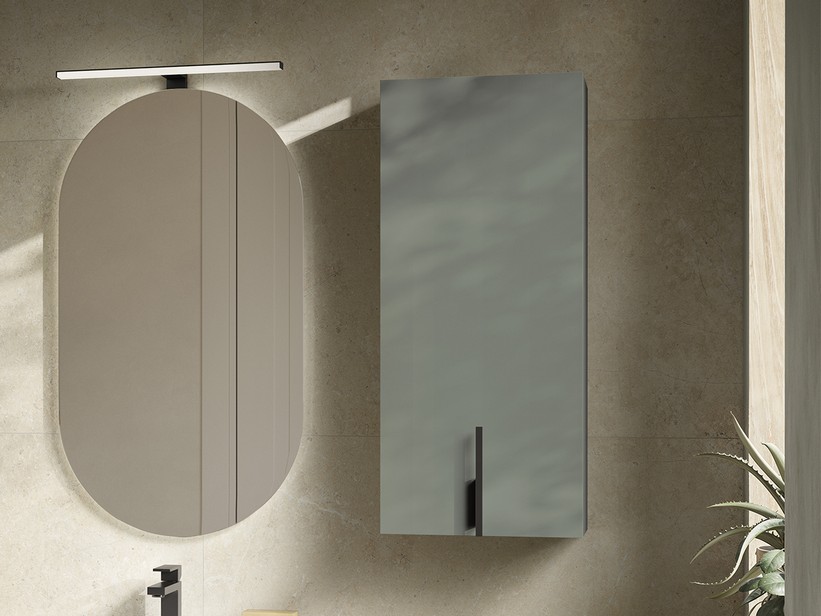 DESK : Meuble avec 1 porte ouvrant à droite et à fermeture lente L36x25xH84 cm avec 2 étagères internes en verre, en mélaminé stratifié finition vert mat et poignée en métal noir mat