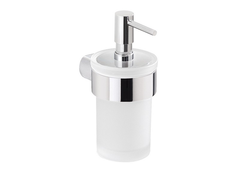 LILY distributeur de savon mural chrome. Réalisé en acier inoxydable et Cromall®, avec des contenants en verre satiné. Le Cromall® est un revêtement de surface qui associe l'acier inoxydable à un revêtement en chrome, créant un matériau à la fois résistant et durable.