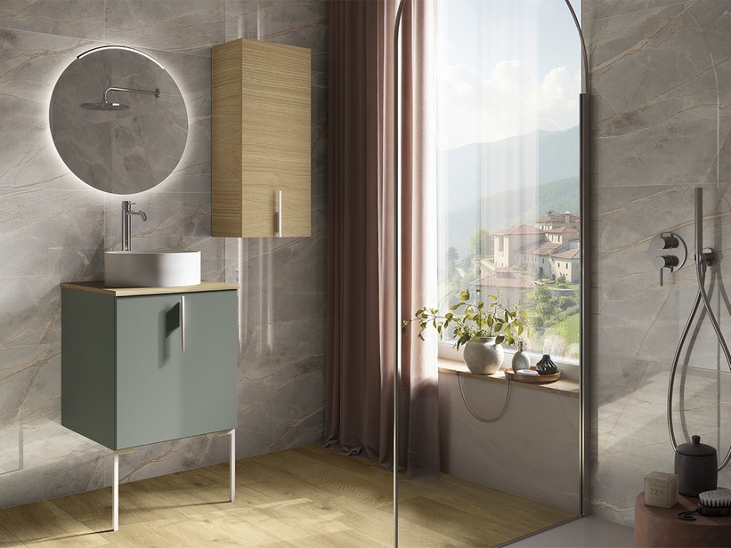 Meuble de salle de bains DESK 50 cm 1 porte vert mat/chêne - Poignée et pieds blanc mat