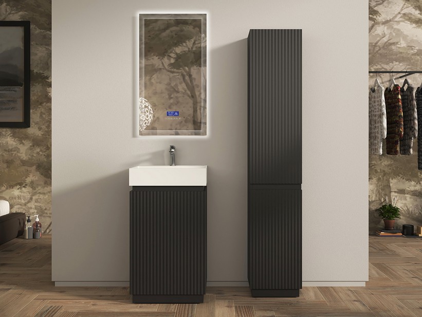 Meuble salle de bains à poser FARO 50 cm cannelé noir mat et lavabo Unitop en résine TRIBECA blanc mat