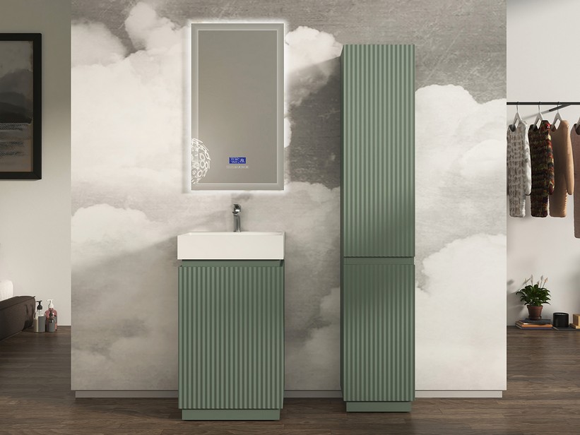 FARO : Meuble de salle de bains à poser L51 cm comprenant un meuble sous-vasque en MDF recouvert de PVC finition vertmat L51xP45xH90 cm avec 1 grand tiroir + 1 tiroir intérieur à fermeture amortie, poignée intégrée type gorge. Motif cannelé vertical réalisé par fraisage sur la façade du tiroir. - Lavabo Unitop avec vasque intégrée série TRIBECA en résine L51xP44xH11,5 cm avec trou pour mitigeur et trop-plein, cache-bonde en résine inclus, finition blanc mat.