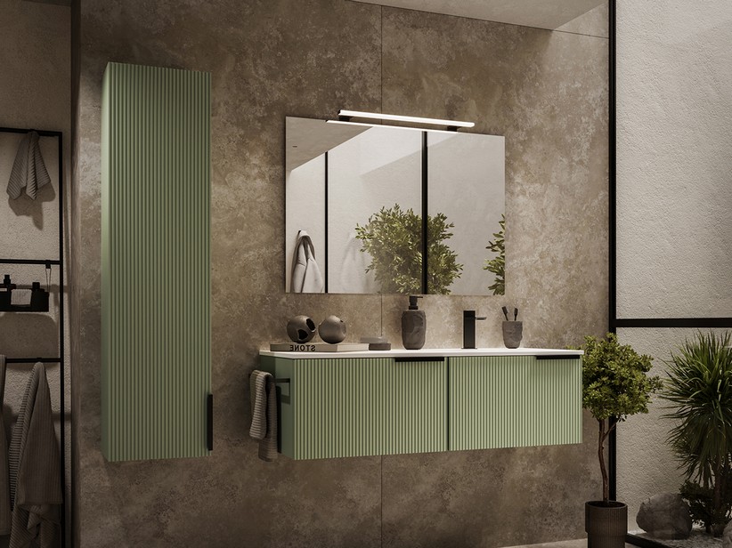 Meuble salle de bains AVIVO 120 cm 2 tiroirs cannelé vert mat et lavabo céramique droite blanc brillant