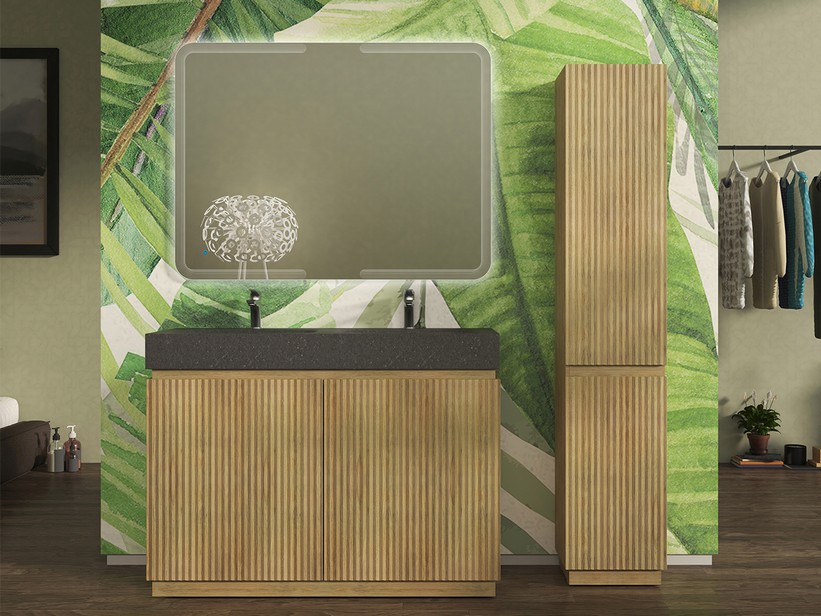 Meuble de salle de bains FARO posé au sol L121 cm composé d 'une base sous-vasque en MDF revêtue de PVC, finition chêne tabac, dimensions L121×P45 ×H90 cm, avec 2 grands tiroirs + 2 tiroirs internes à fermeture amortie, poignées intégrées en gorge, design cannelé vertical réalisé par fraisage sur la façade des tiroirs. Lavabo unitop avec vasque intégrée, série HPL en quartzite effet pierre foncée, dimensions L121×P44×H11,5 cm, avec trou pour mitigeur. Bonde avec cache effet pierre foncée non incluse et vendue séparément.