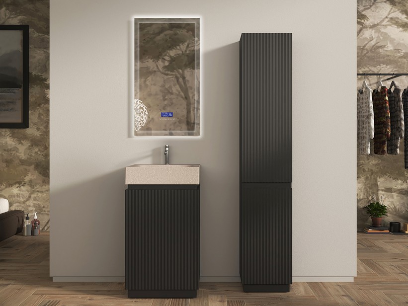Meuble de salle de bains FARO posé au sol L51 cm composé d'une base sous-vasque en MDF revêtue de PVC, finition noir mat, dimensions L51×P45×H90 cm, avec 1 grand tiroir + 1 tiroir interne à fermeture amortie, poignée intégrée en gorge, design cannelé vertical réalisé par fraisage sur la façade du tiroir. Lavabo unitop avec vasque intégrée, série HPL en quartzite effet pierre claire, dimensions L51×P44×H11,5 cm, avec trou pour mitigeur. Bonde avec cache effet pierre claire non incluse et vendue séparément.