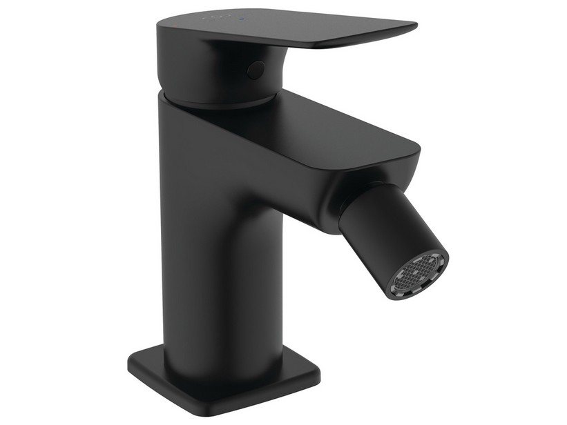 Mitigeur monocommande pour bidet noir soie, avec bonde Clic-Clac et système BlueStart. Bec fixe avec sortie de 95 mm, zone de confort de 64 mm, cartouche à disque céramique FirmaFlow® de 28 mm avec limiteur de température, aérateur orientable M16,5x1 avec débit de 3,8 l/min, fixation EasyFix, fourni avec des flexibles G3/8 PEX.