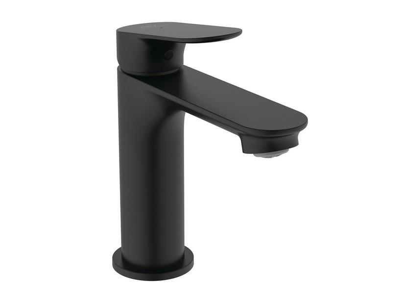 Mitigeur monocommande pour lavabo noir soie avec bonde Clic-Clac et système BlueStart®. Avec un bec fixe, un aérateur M24x1 avec débit maximal de 3,8 l/min et une cartouche FirmaFlow® de 28 mm. Sortie du bec 95 mm, zone de confort 75 mm. Système de fixation EasyFix. Flexibles avec raccord G3/8".
