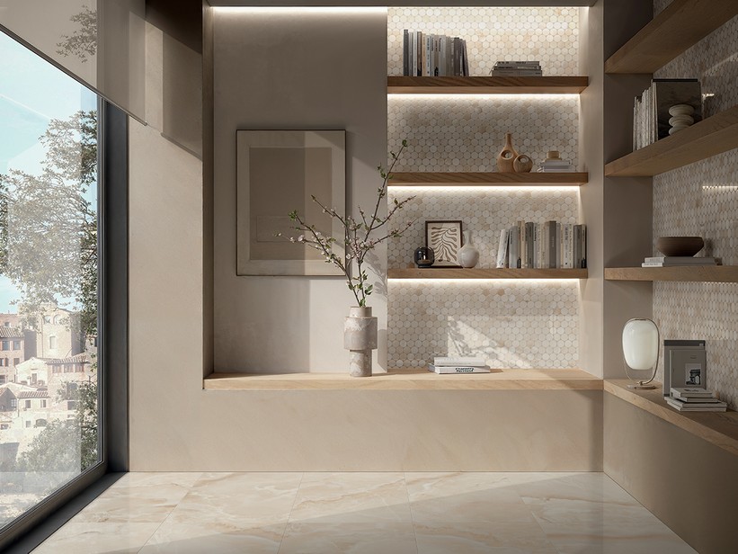 Les nuances de beige rendent le produit chaleureux et enveloppant, avec de légères veinures et de douces nuances dorées qui rappellent la pierre onyx. Ces détails, subtilement entrelacés, donnent naissance à un délicat effet nuageux, créant des jeux de lumière qui apportent profondeur, luminosité et une sensation d'harmonie aux espaces.