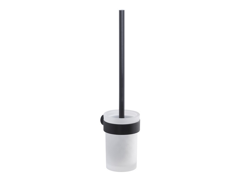 LILY porte-balai noir mat. Réalisé en acier inoxydable et Cromall®, avec des contenants en verre satiné. Le Cromall® est un revêtement de surface qui associe l'acier inoxydable à une finition NOIR MAT, offrant un matériau à la fois résistant et durable.
