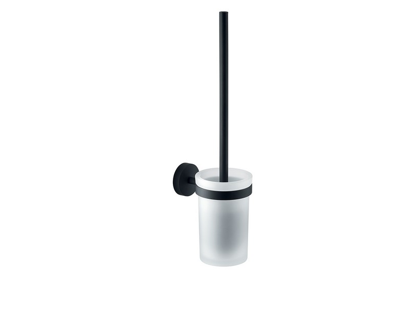 TULI porte-balai mural noir mat. Réalisé en acier inoxydable et Cromall®, avec des contenants en verre satiné. Le Cromall® est un revêtement de surface qui associe l'acier inoxydable à un revêtement NOIR MAT, créant un matériau à la fois résistant et durable.