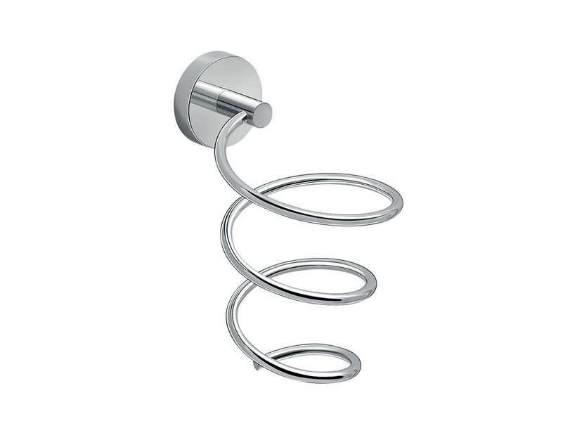 TULI support sèche-cheveux chrome. Réalisé en acier inoxydable et Cromall®, avec des contenants en verre satiné. Le Cromall® est un revêtement de surface qui associe l'acier inoxydable à un revêtement CHROME, créant un matériau à la fois résistant et durable.